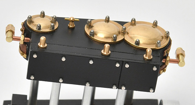| You can now assemble the block and base for the final time. To complete, make and fit the steam pipe fittings at each end of the block. These are made from 2mm copper rod, 3mm brass rod and 4mm hex bar, cut and drilled to resemble couplings. |