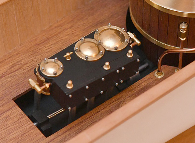 | When you're satisfied that all parts of the engine assembly have been made as well as you can make them, glue it in place on the sub-floor below the forward well deck making sure the crankshaft is on the centre line. |