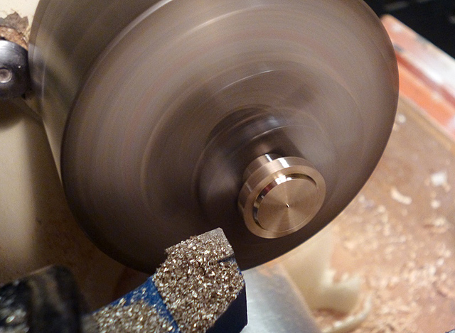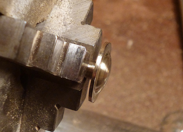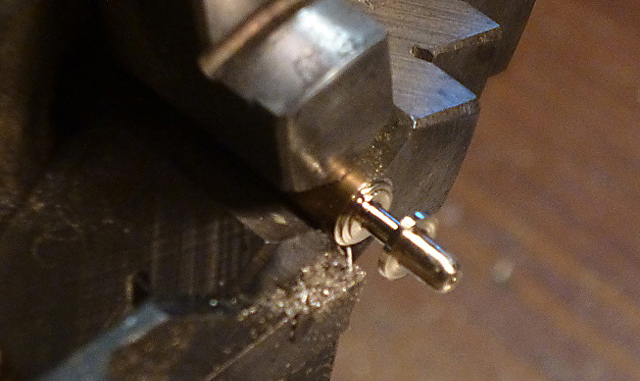 three cylinder heads are turned from brass rod, leaving a short peg underneath