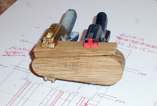 b) Drill a small hole in each end of the block to accommodate the 'steam pipes' that will be fitted later.