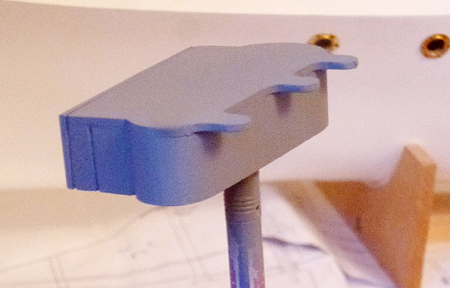 2mm plastic sheet is used to make the base of the block. This extends outwards in three places to provide the 'tab' mounts for three of the supporting rods later. Another piece of 2mm plastic sheet fits on the side of the block (on the left in the photo). Detail is important so file in grooves as required. The photo shows the engine block upside-down after being sprayed with grey primer. Sand and add further coats of primer until a smooth finish is obtained. With reference to your plans: