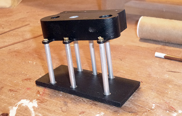 c) Calculate the positions of the six aluminium supporting rods and drill 4mm diameter holes for each of them in the underside of the block. There will be one in each plastic tab projecting from the block's base, and three in the block itself. d) Drill 12 tiny holes in the flat side for the steel bolts that will be fitted later. Spray the assembly satin black to finish. |