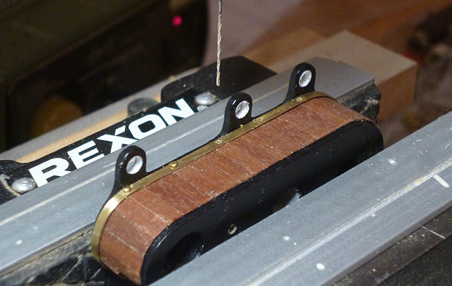 then gluing the competed assembly to the block. Shape two thin 3mm brass strips to fit around the top and bottom of the block and drill holes for the brass pins which will hold the strip in place (you may find it easier to drill the strips first). Cut the pins about 5mm below the head and superglue them in place.