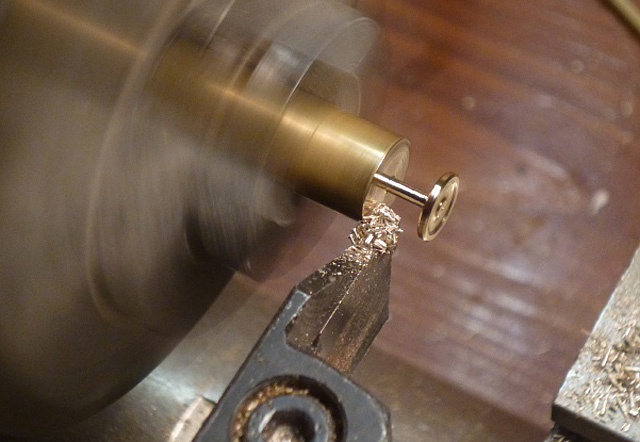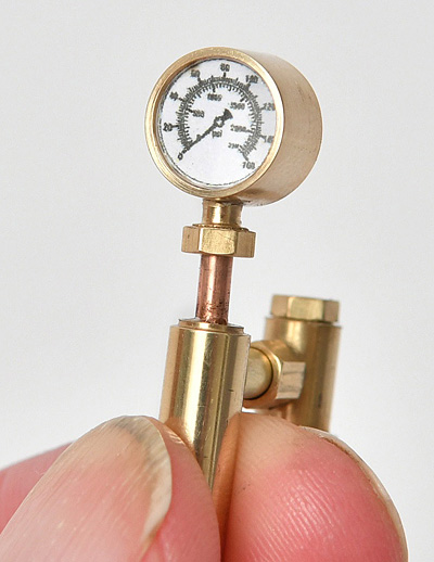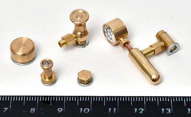 The most striking fitting features the pressure gauge. This is made from 10mm brass rod, drilled out from the front to accommodate a dial (found online, printed and cut to size). The plastic disk from a 10mm flangeless porthole is a push fit over it.