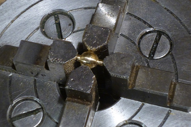 | Drilling a hole into a sphere is a bit tricky. I needed a 4-jaw chuck because the piece was asymmetric. |
