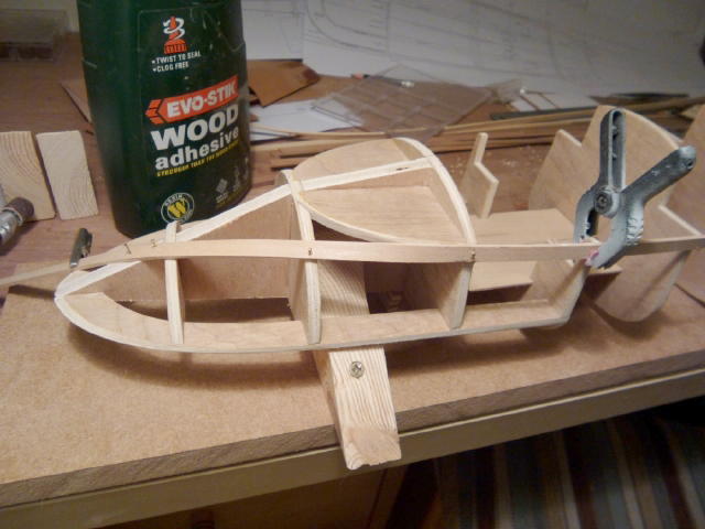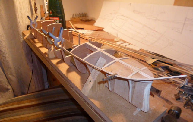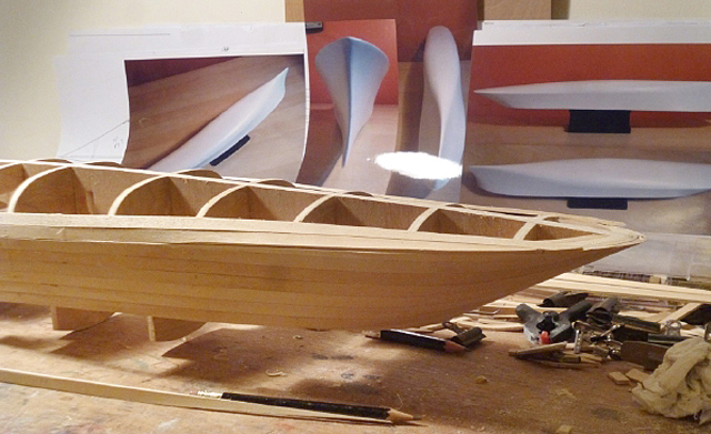 With sandpaper or a coarse file, bevel the edges of the formers, infills and chines to ensure a smooth even curve along the hull. Where the angles are most acute, eg at the prow and stern, the bevels will most significant. Offer up a plank to test the angles. When everything looks exactly right, you can start the planking. Start at the top of the hull, ie the gunwales. Use steam to create the curves and twists as accurately as you can before fitting each plank. For the first plank on each side, glue them to the centre (straight) section of the boat first, then work towards both ends. Add glue along the edges too for strong joins without gaps. At the front the planks will curve up naturally above the deck.
