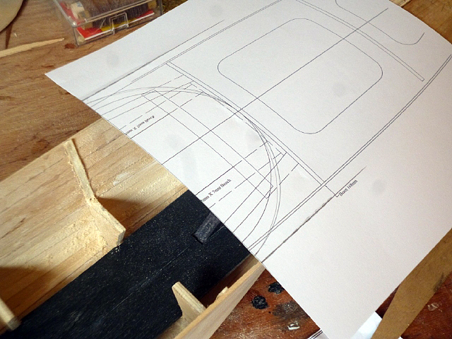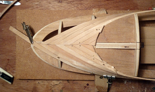 | The upper part of the hull behind the aft deck needs to be planked separately, again trimmed down the centre line of the keelson. Take care to leave the correct shape for the small aft deck which will fitted later. | |