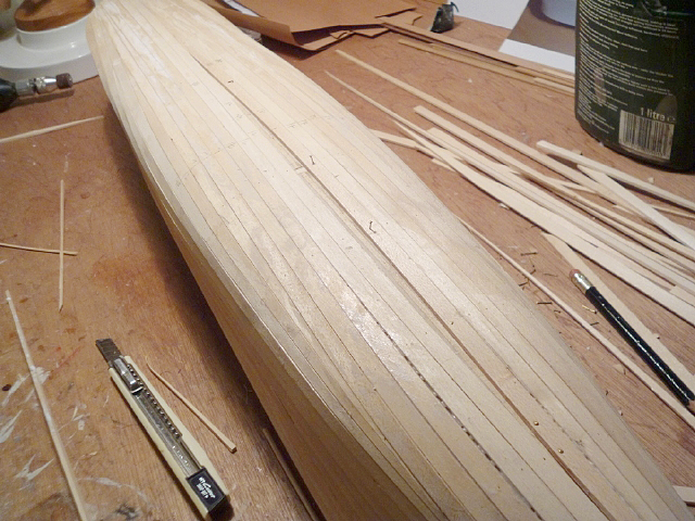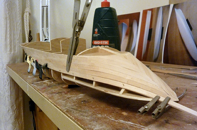 | Continue planking down the hull, negotiating the rear chine as you get to it. Note how the planks are fitted and trimmed over the pointed stern. | |