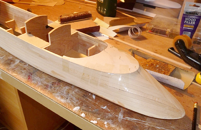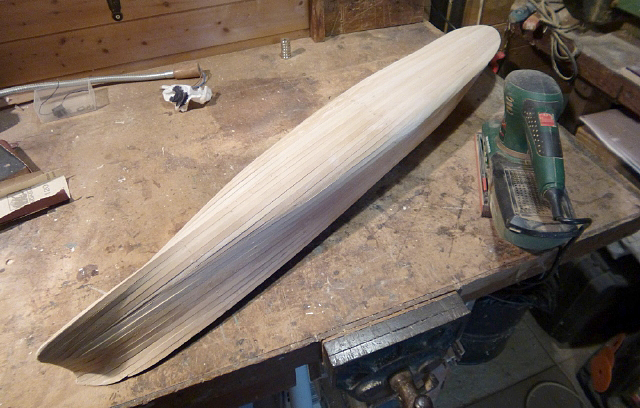 SANDING At this stage the planked hull will look very rough, but if you've done it correctly, the beautiful lines of Project X0.67 are inside. Now you must sand, carve and perhaps fill until you get the shape exactly right. Time spent now will pay off handsomely in the end! |