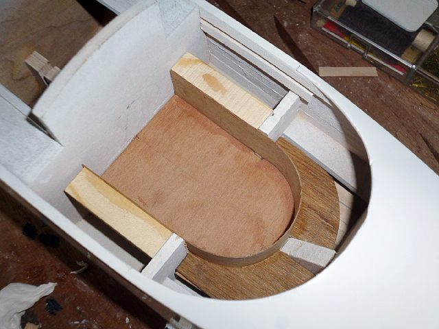 Cut the floor of the aft well from 2mm ply sheet. It doesn't have to fit the whole well perfectly, but must be wide enough to take supporting blocks between F9 and F10 for the seat fronts as shown in the photo. When these blocks are fitted, cut a semi-circular former from 4mm ply and glue it to the floor. This will form the curve in the seating later.