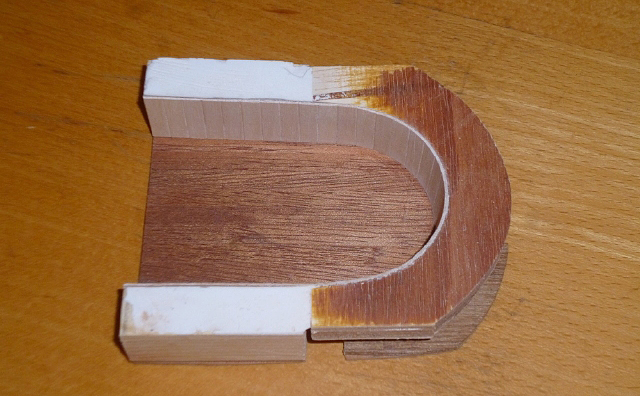 Using 0.5mm ply sheet make the U-shape needed as a backing for the vertical planking between the floor and the seating. Here you can see the assembly being test-fitted. |