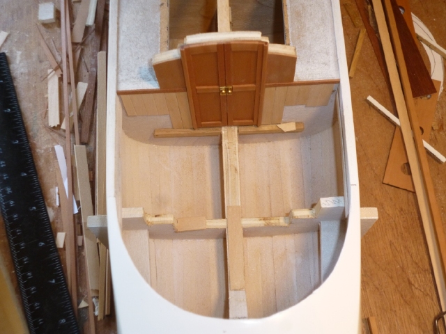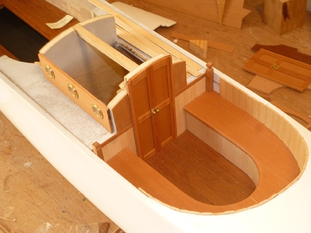 Now is a good time to divert a little and work on the front of the cabin, because the aft well assembly will bear against it. With reference to the plans, use pear veneer and pear strip to assemble the door and surrounding panels in situ on the rear face of F9. Be sure to get the height of the door exactly right to fit the hatch which will later fit onto it. The handles are made from brass strip and brass spheres flatted on one side.