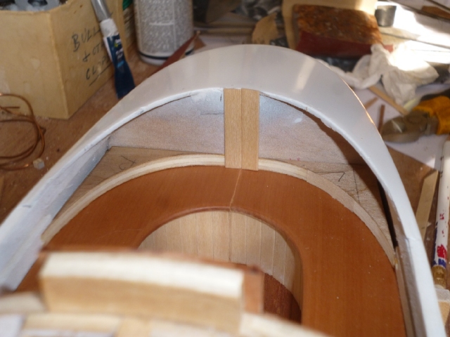 Cut and fit the two quadrant formers which will support the base of the upper vertical planking, making sure they match the curve on the aft deck above.