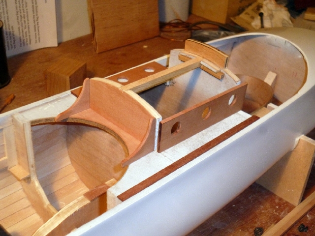 Cut and fit a rectangle of 4mm ply sheet between F7 and F8, with a semicircle to accommodate the boiler later. Allow for a 1mm edging strip in this area.