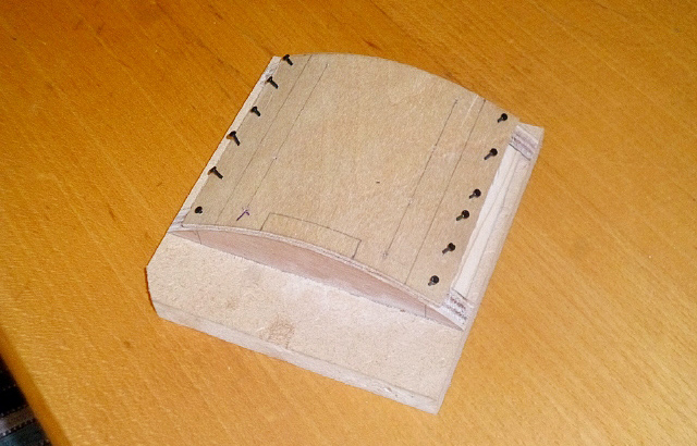Cut the ply about 10mm too wide on each side, then use steam to create the curve and nail it in position on the former. When dry, remove the nails, trim the roof to the correct width and sand smooth. Make a rectangular cut-out to fit round the top section of F9. Mark and drill the holes for the handrail stanchions.