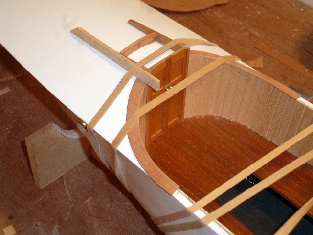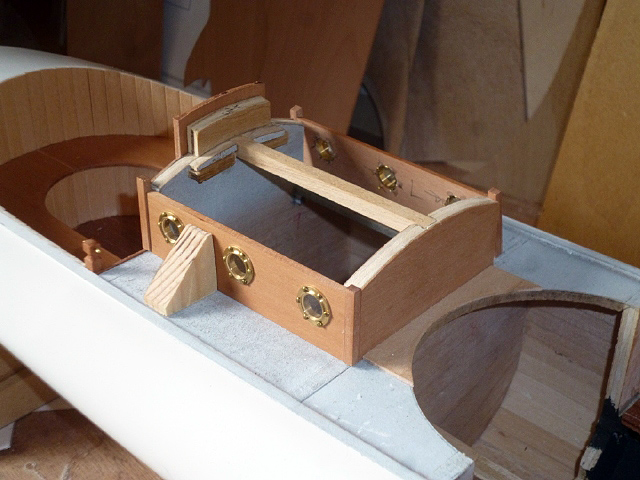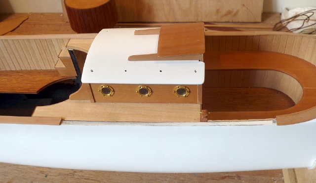 Make three holes in each cabin side for the portholes, glue the portholes in place and then glue the cabin sides in place between F8 and F9. Cut and fit a 4x4mm pear strip vertically to each corner of the cabin.