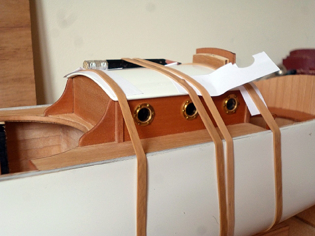 Once the eight coaming sections are fitted, fashion the rubbing strake from 2x1mm pear strip, steam the ends to fit the curves of the hull and glue them in place. I used PVA; it's not very strong on the white surface but any excess can be wiped off, unlike UHU or superglue. |
