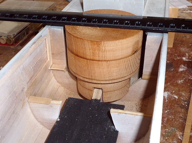 | The core of the boiler is made from simple wood blocks, glued in layers until a block larger than the boiler is achieved. Cut the block into an octagon for easier turning, then put it on a lathe and turn it the size and shape required. Remember to allow for the thickness of the mahogany planking that will be added later. | |