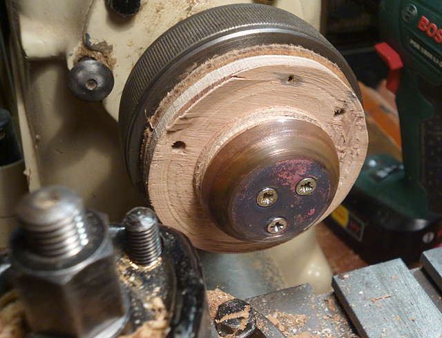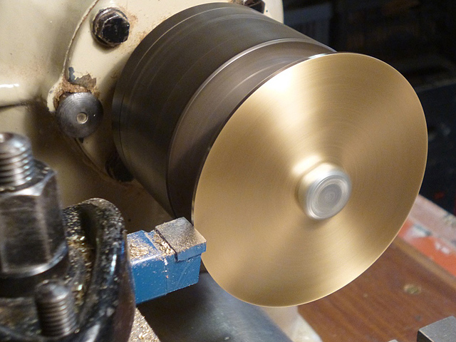 the dome has to fit snugly into the hole in the brass disk. Fix an annealed 0.5mm copper disk onto this former so it can't rotate against it (I used three closely spaced screws). Copper spinning is too complicated to describe here so please refer to YouTube for the technique. I found that the process work-hardens the copper; if so, remove the disk, anneal it again and continue spinning until the correct dome shape is achieved. Polish it on the lathe and then trim the lower edge flat on a disk sander by reversing it onto a block of wood. When satisfied, glue the dome onto the boiler. It should just fit inside the hole in the brass disk. The funnel is best left to the end because it's very likely to get knocked off accidentally! |