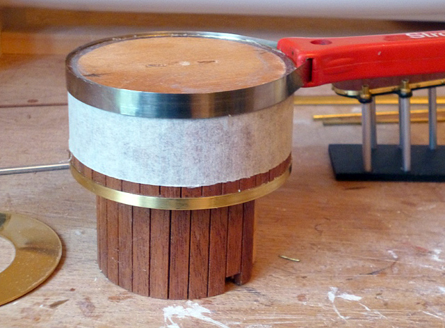 Fashion the upper and lower brass bands as accurately as possible from brass strip, then glue them in place with UHU. I used a jar opener to keep them perfectly circular while the glue dried. Drill three holes in the correct positions for steam pipes that will be fitted later, and with a Dremel enlarge them neatly until they are large enough to accommodate 4mm nuts. Finish the structure with aerosol varnish. |